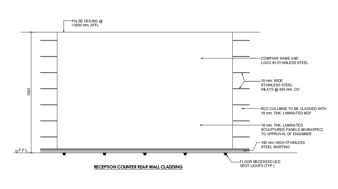 Reception counter rear wall cladding view is given in this Autocad drawing file. Height of the cladding is 3000mm. 10mm wide stainless steel, RCC column to be cladded with 18mm thickness laminated MDF, 18mm thickness of laminated sculptured panels, 100mm high stainless steel skirting and other details are given. For more details download the AutoCAD drawing file. Thank you for downloading the Autocad drawing file and other CAD program files from our website.