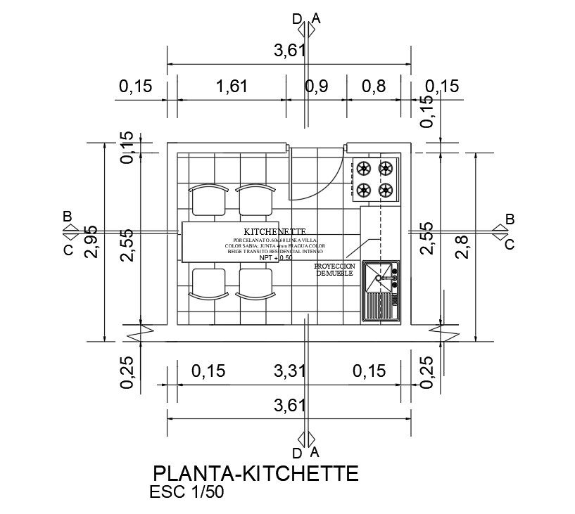 3x3m kitchen plan is given in this Autocad drawing file.Download the Autocad model.