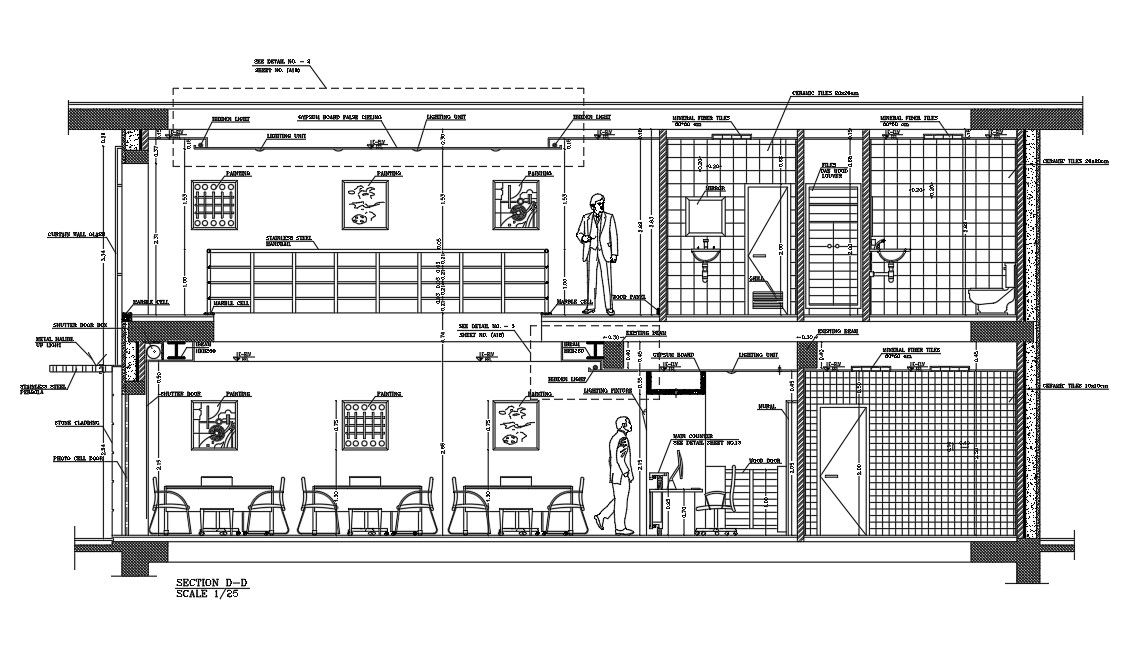 A section view of 11x14m ground floor bank plan is given in this Autocad drawing file.Download the Autocad model.
