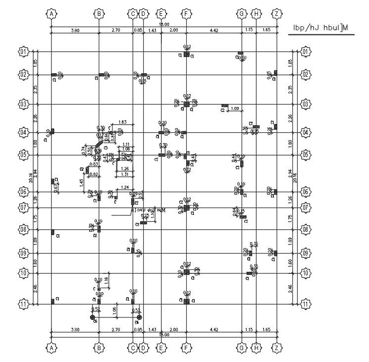 Column layout of 38x40m villa plan is given in this Autocad drawing file. Download now.