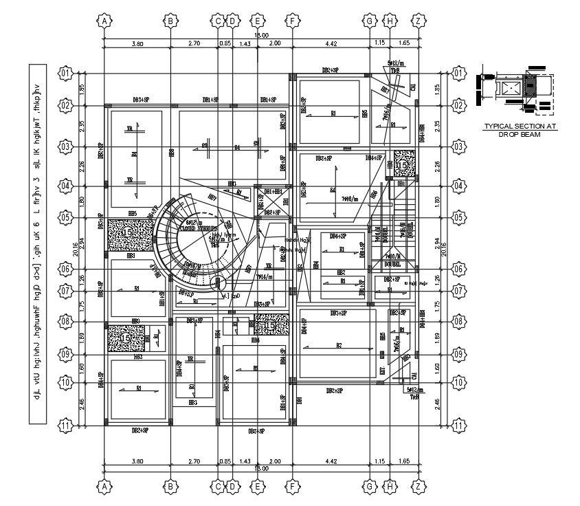 Ground floor main beam layout of 38x40m villa plan is given in this Autocad drawing file.Download the Autocad model.