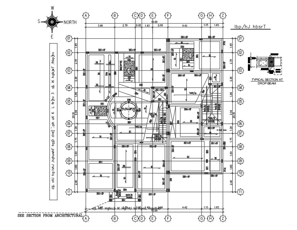 First floor main beam layout of 38x40m villa plan is given in this Autocad drawing file.Download now.