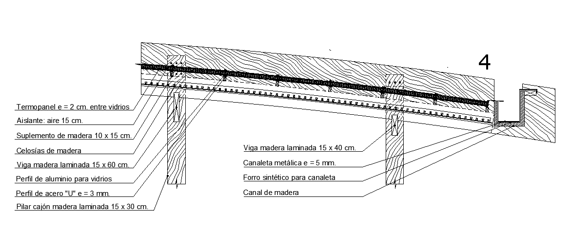 Column cum slab structure joining detail is given in this Autocad drawing file. Material details are given in this model. Galvanized steel profile for joining, termopanel e = 2 cm. Between glass, aluminum profile, hexagonal bolt, insulation: air 15 cm, wood insert 10 x 15 cm, laminated wood joist 10 x 30 cm, wood dowel 20 x 30 cm, hidden steel fitting, laminated wood beam 15 x 40 cm, drawer pillar laminated wood 15 x 30 cm and other details are mentioned. For more details download the Autocad drawing file. Thank you for downloading the Autocad drawing file and other CAD program files from our website.