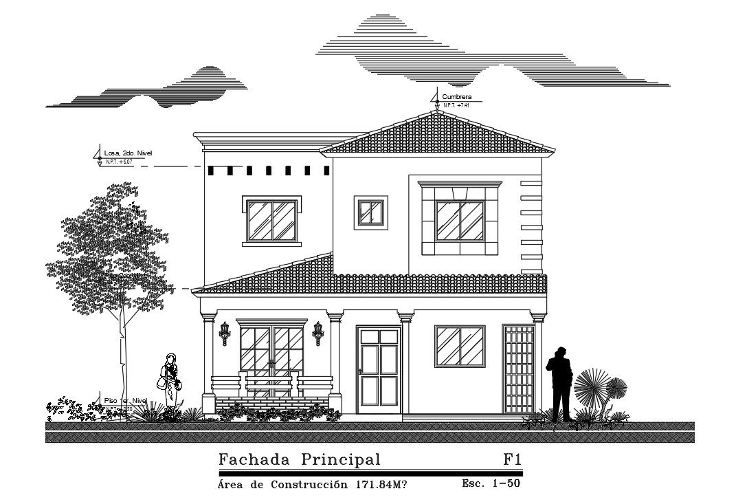 Front elevation view of 10x20m house building is given in this Autocad drawing file. Download now.