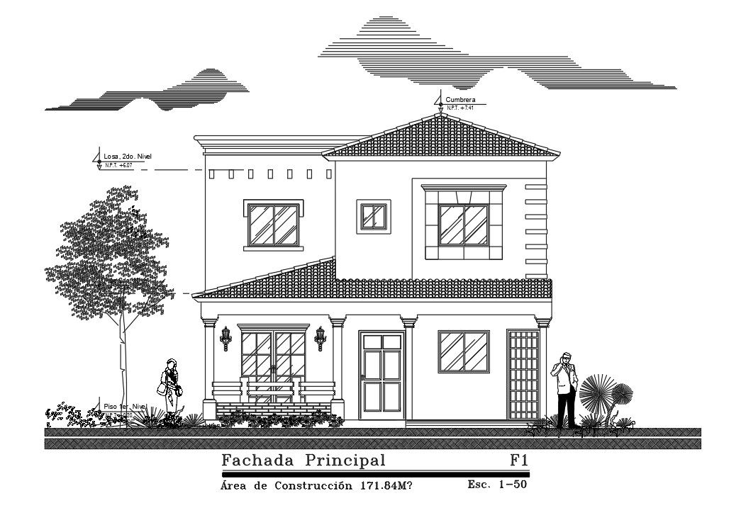 Front painting elevation view of 10x20m house building is given in this Autocad drawing file. This is G+1 house building. In the ground floor, the living area, dining area, garden, car parking, kitchen, gas area, ironing area, lavatory, patio, and common toilet is available. Master bedroom with attached toilet, two kid’s room, guest room, common toilet, and family lounge area is available in the second floor. For more details download the Autocad file. Thank you for downloading the Autocad drawing file and other CAD program files from our Cadbull website.