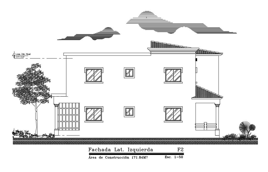 Left side painting elevation view of 10x20m house building is given in this Autocad drawing file. This is G+1 house building. In the ground floor, the living area, dining area, garden, car parking, kitchen, gas area, ironing area, lavatory, patio, and common toilet is available. Master bedroom with attached toilet, two kid’s room, guest room, common toilet, and family lounge area is available in the second floor. For more details download the Autocad file. Thank you for downloading the Autocad drawing file and other CAD program files from our Cadbull website.