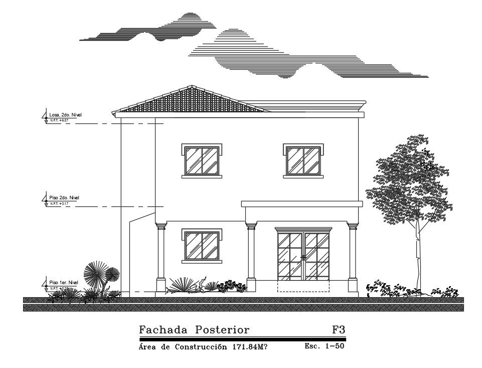 Rear side elevation view of 10x20m house building is given in this Autocad drawing file. This is G+1 house building. In the ground floor, the living area, dining area, garden, car parking, kitchen, gas area, ironing area, lavatory, patio, and common toilet is available. Master bedroom with attached toilet, two kid’s room, guest room, common toilet, and family lounge area is available in the second floor. For more details download the Autocad file. Thank you for downloading the Autocad drawing file and other CAD program files from our Cadbull website.