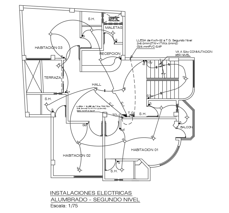 Electrical installation lighting detail of 10x10m commercial cum staying room second floor plan is given in this Autocad drawing file. Download the Autocad model.
