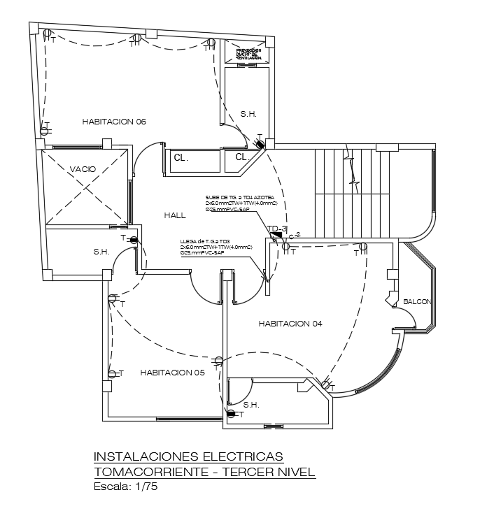 Electrical installation current socket detail of 10x10m commercial cum staying room terrace floor plan is given in this Autocad drawing file. Download the Autocad model.