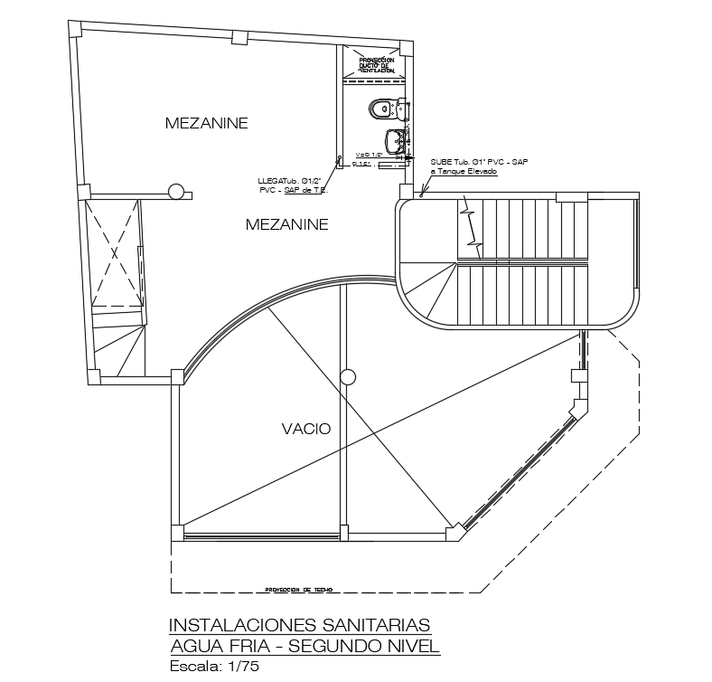 Sanitation cold drainage detail of 10x10m commercial cum staying room second floor plan is given in this Autocad drawing file. Download the Autocad model.