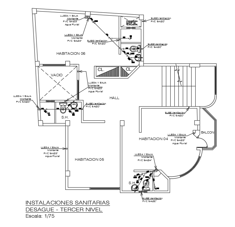 Sanitation drainage detail of 10x10m commercial cum staying room third floor plan is given in this Autocad drawing file.Download the Autocad model.