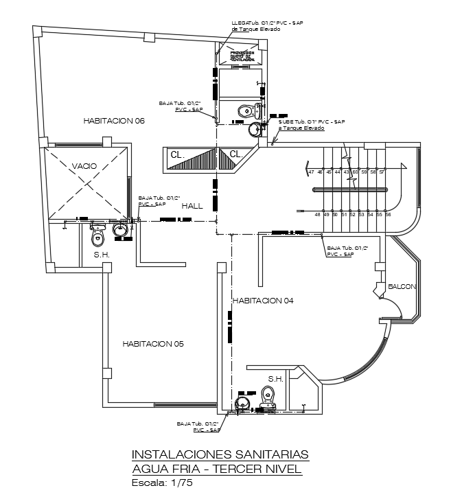 Sanitation cold water detail of 10x10m commercial cum staying room third floor plan is given in this Autocad drawing file. Download the Autocad model.
