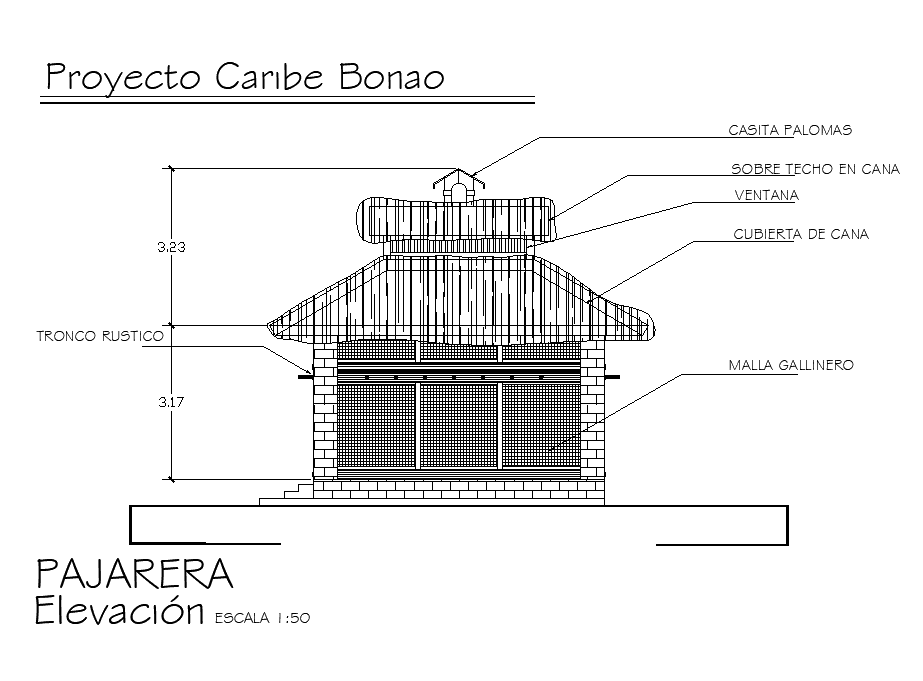 The room house building front elevation design that shows brick wall and wooden roof detail. also has palomas house, on roof in cana, window, cana cover, chicken mesh and rustic trunk in dwg file. Thank you for downloading the Autocad file and other CAD program files from our website.