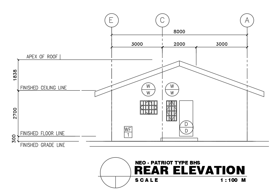 Rear elevation view of 9x9m hospital building is given in this Autocad drawing file. Download the Autocad model.