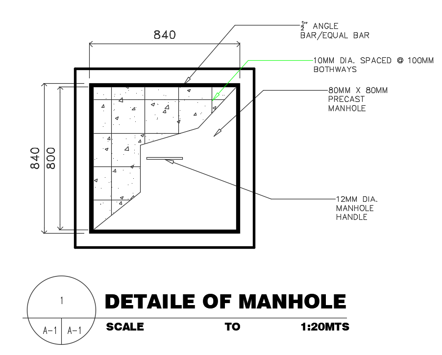 840x840mm of manhole plan is given in this Autocad drawing file. This is given for 9x9m hospital building. Manhole handle, precast manhole, and bar is specified in this drawing model. For more details download the Autocad file. Thank you for downloading the Autocad file and other CAD program files from our website.