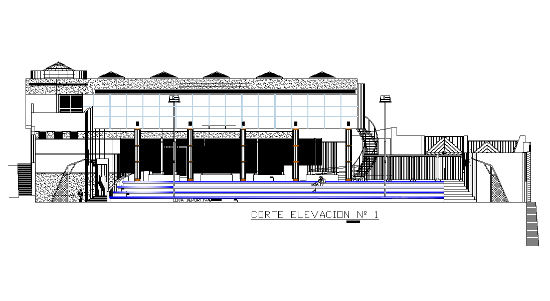 The architecture club house building front elevation design that shows spa room, change room, services staff area, lift, staircase, store room, dining area and sports game basket ball play ground with railing wall design dwg file. Thanks for downloading the file and another CAD program from the cadbull.com website.