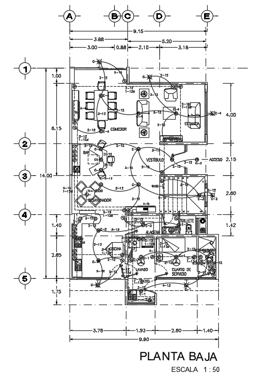 An electrical layout of 9x14m ground floor house plan is given in this Autocad drawing file. Download the Autocad model.