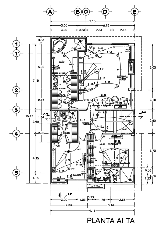 An electrical layout of 9x14m first floor house plan is given in this Autocad drawing file. Download the Autocad model.