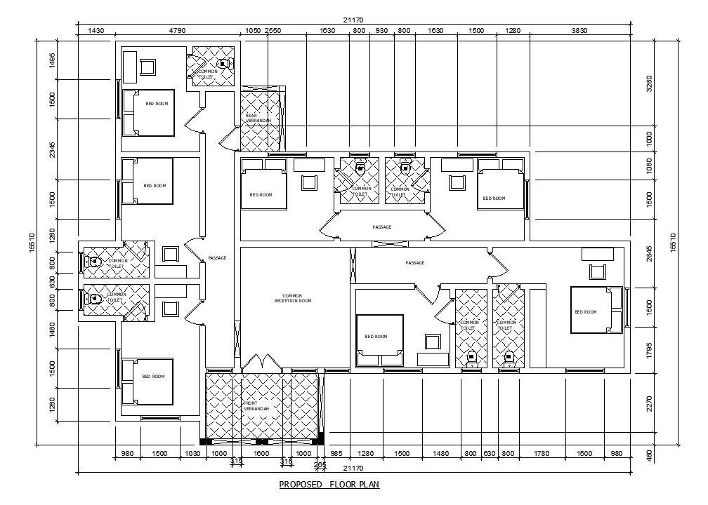 The bedrooms hotel ground floor plan AutoCAD drawing that shows total 7 bedrooms with all dimension detail, 150mm thick buffer wall, cast iron cover, and furniture layout design. total 70'X50' plot size with center line plan detail dwg file. Thank you for downloading the Autocad files and other CAD program files from our website.