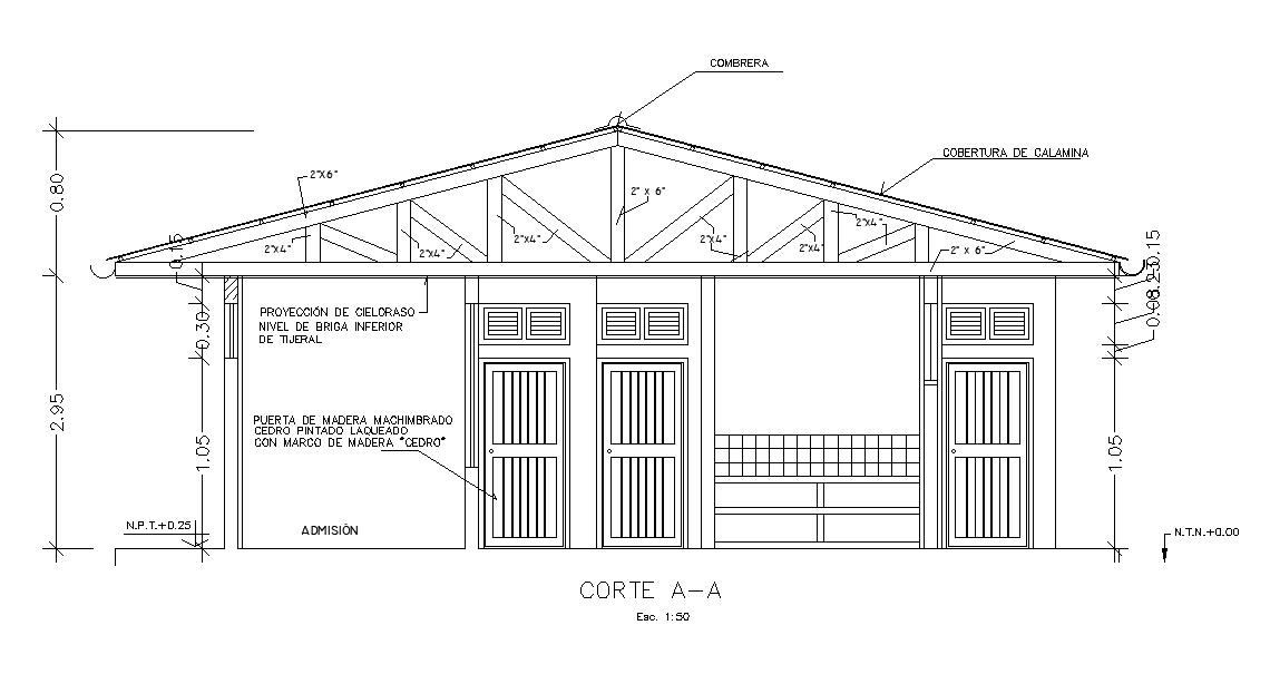The truss span roof house building section CAD drawing which consist ceiling projection iteral lower brig level, padded wood door lacquered painted cedar with "cedro" wood frame, calamine covering, and comber detail dwg file. Thank you for downloading the 2D Autocad files and other CAD program files from our website.