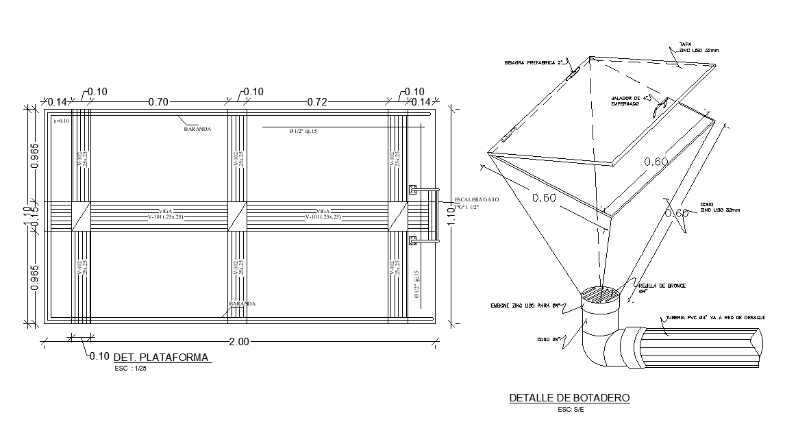 The platform with laundry section CAD drawing that shows platform, laundry detail, 4 "pvc pipe goes to drain net, smooth zinc embone for, cat ladder, railing, and 2" pre-fabric hinge detail dwg file. Thank you for downloading the Autocad file and other CAD program files from our website.