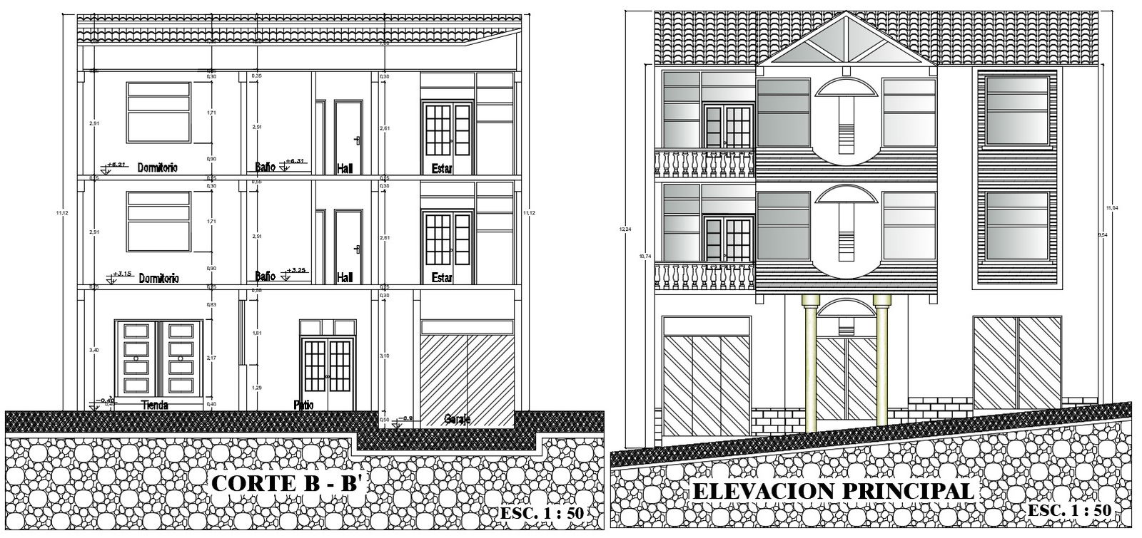 An elevation view of 12x15m house building has been given in this Autocad drawing file.Download now.