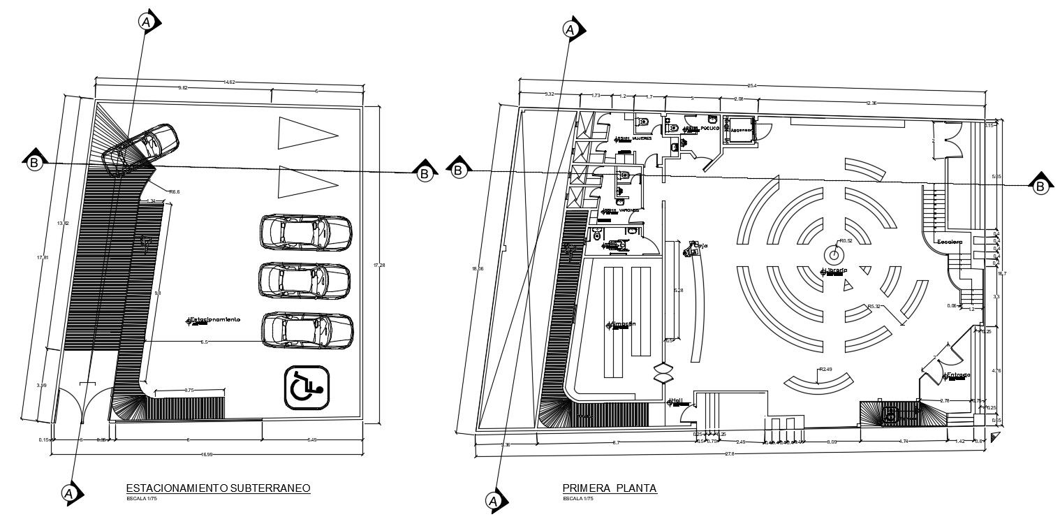 27x19m college plan is given in this Autocad drawing file. This is G+1 college building. Car parking and first floor plan is available in this drawing. For more details download the Autocad file and other CAD program files from our website. Thank you for downloading the Autocad drawing file and other CAD program files from our website.
