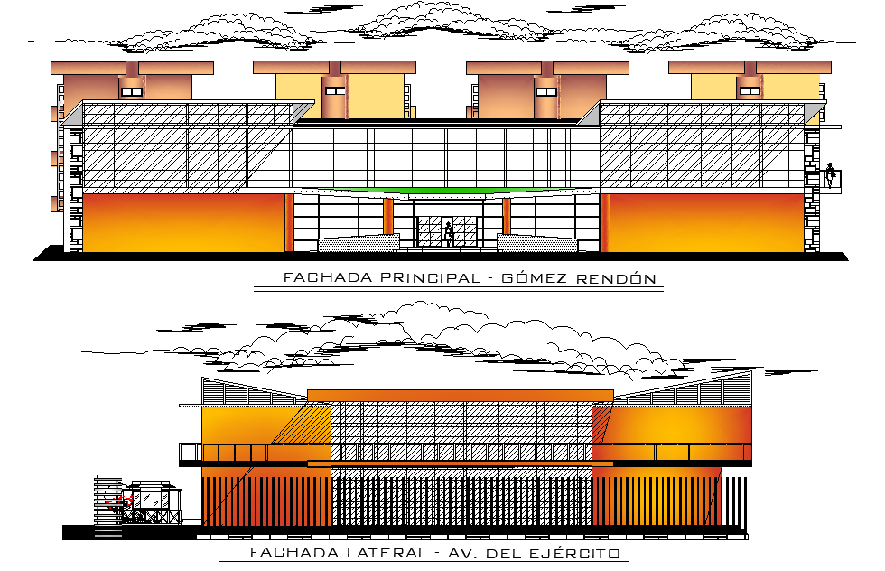 An elevation view of 38x52m commercial building is given in this Autocad drawing file. Download now.