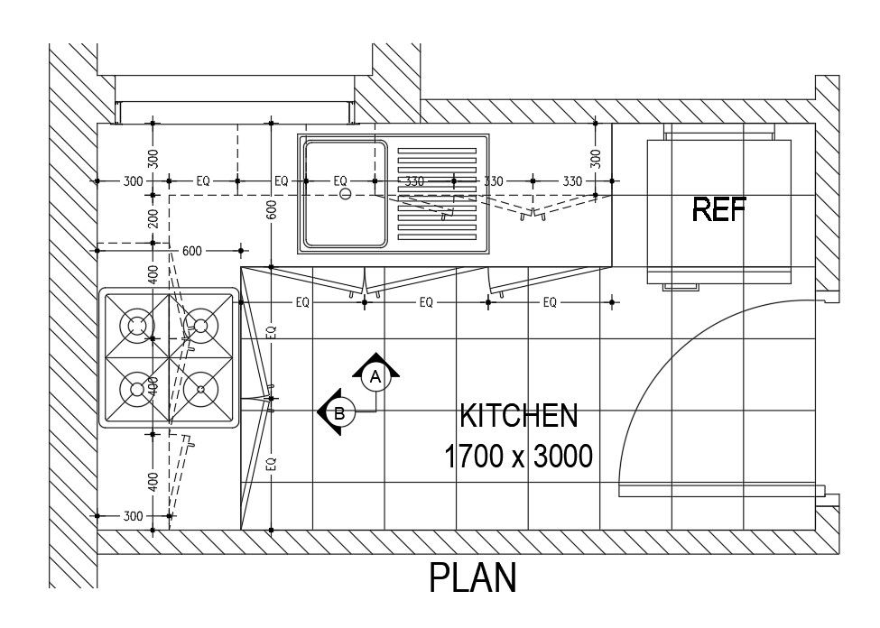1700x3000mm kitchen plan is given in this Autocad drawing file.Download now.