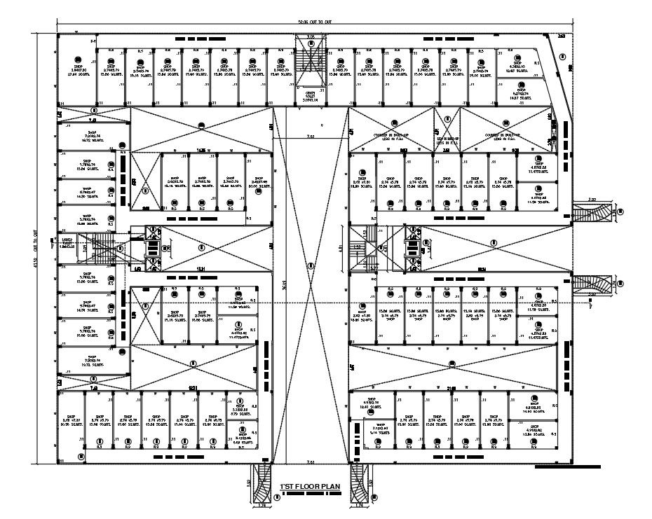 52x43m first floor plan of commercial shop is given in this AutoCAD drawing file. This is G+4 commercial building. Basement floor is provided for car parking. In this many shops are available with measurement. For more details download the Autocad drawing file. Thank you for downloading the Autocad file and other CAD program files from our website.
