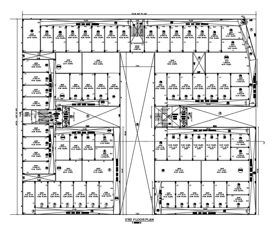 52x43m third floor plan of commercial shop is given in this AutoCAD drawing file. This is G+4 commercial building. Basement floor is provided for car parking. In this many shops are available with measurement. For more details download the Autocad drawing file. Thank you for downloading the Autocad file and other CAD program files from our website.