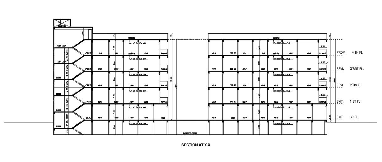 A section view of commercial building is given in this AutoCAD drawing file. This is G+4 commercial building. Basement floor is provided for car parking. In this many shops are available with measurement. For more details download the Autocad drawing file. Thank you for downloading the Autocad file and other CAD program files from our website.