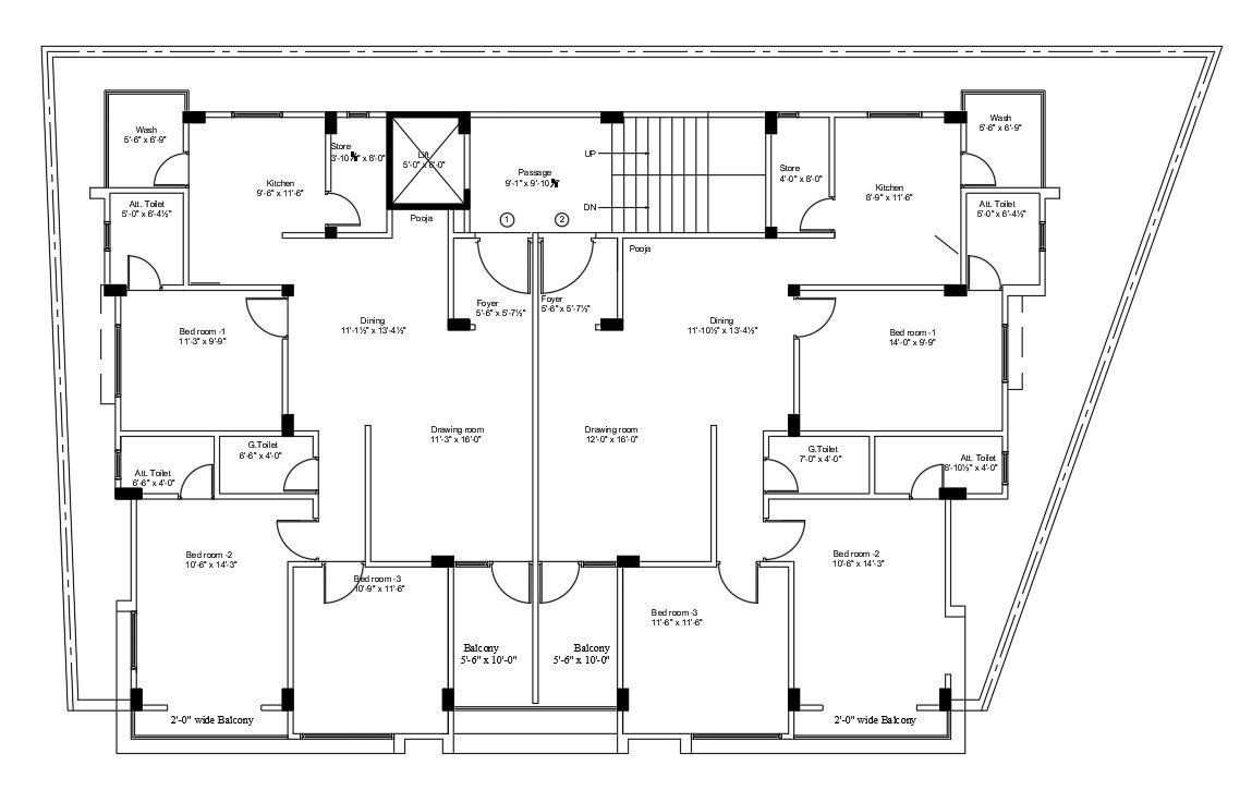 81’x45’ apartment plan is given in this Autocad drawing file. This is G+ 4 apartment building. In each floor two houses are available. These houses are consists of kitchen, dining area, drawing room, living hall, common toilet, master bedroom with attached bathroom, guest room, kid’s room, foyer and balcony is available. For more details download the Autocad drawing file. Thank you for downloading the Autocad file and other CAD program files from our website.
