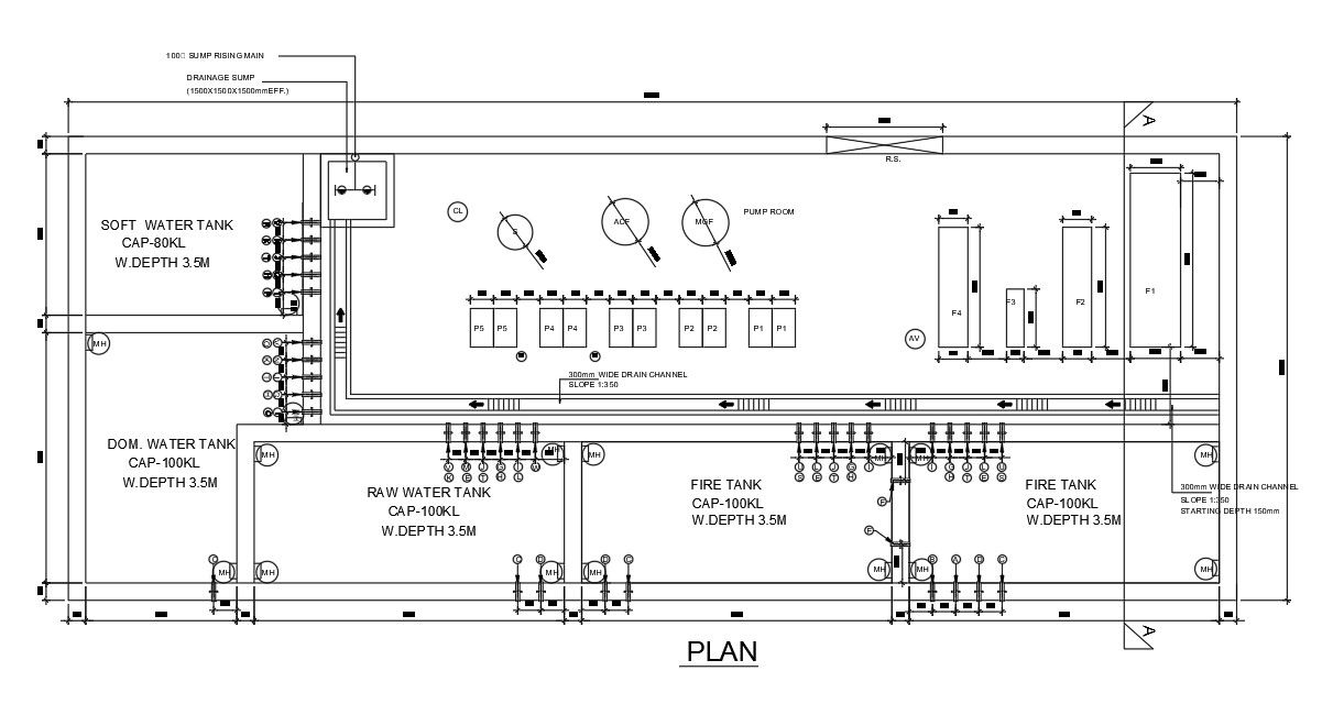 Plan of 30x12m underground pump room detail drawing is given in this Autocad drawing file. In this water tank and fire tank detail is given. Raw water tank, soft water tank, pump room and other details are mentioned. For more details download the Autocad drawing file. Thank you for downloading the Autocad file and other CAD program files from our website.