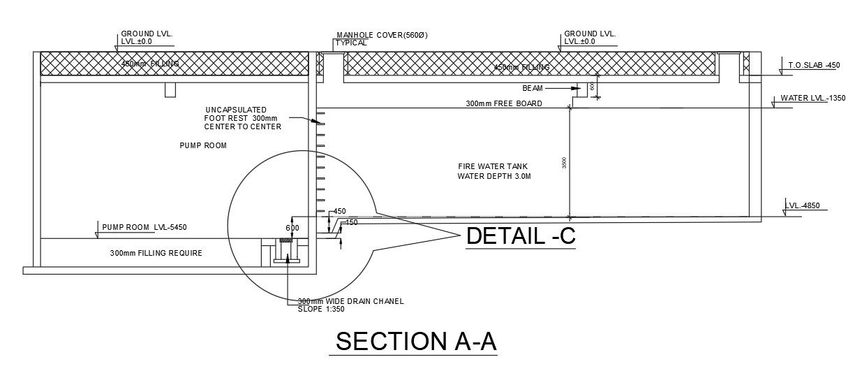 A section view of 30x12m underground pump room detail drawing is given in this Autocad drawing file. In this water tank and fire tank detail is given. Raw water tank, soft water tank, pump room and other details are mentioned. For more details download the Autocad drawing file. Thank you for downloading the Autocad file and other CAD program files from our website.