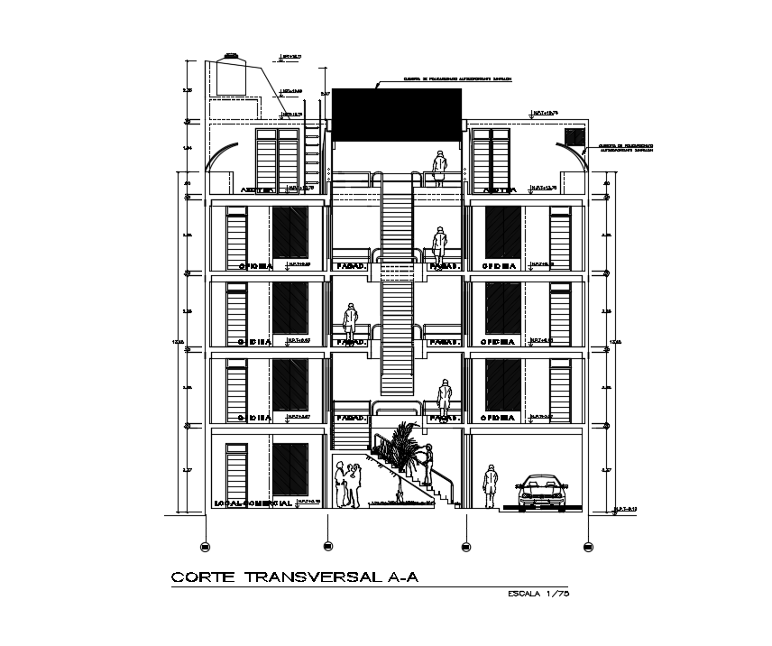 A section view of 16x40m commercial shopping building is given in this Autocad drawing file. Download the Autocad model.