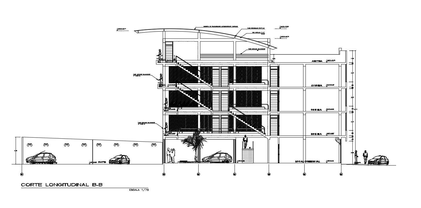 Left side section view of 16x40m commercial shopping building is given in this Autocad drawing file. This is G+4 office building. Local commercial shops, gent’s toilet, ladies toilet and car parking is available in the ground floor. In the first, second & third floor, local commercial shops are available. For more details download the Autocad file. Thank you for downloading the Autocad file and other CAD program files from our website.