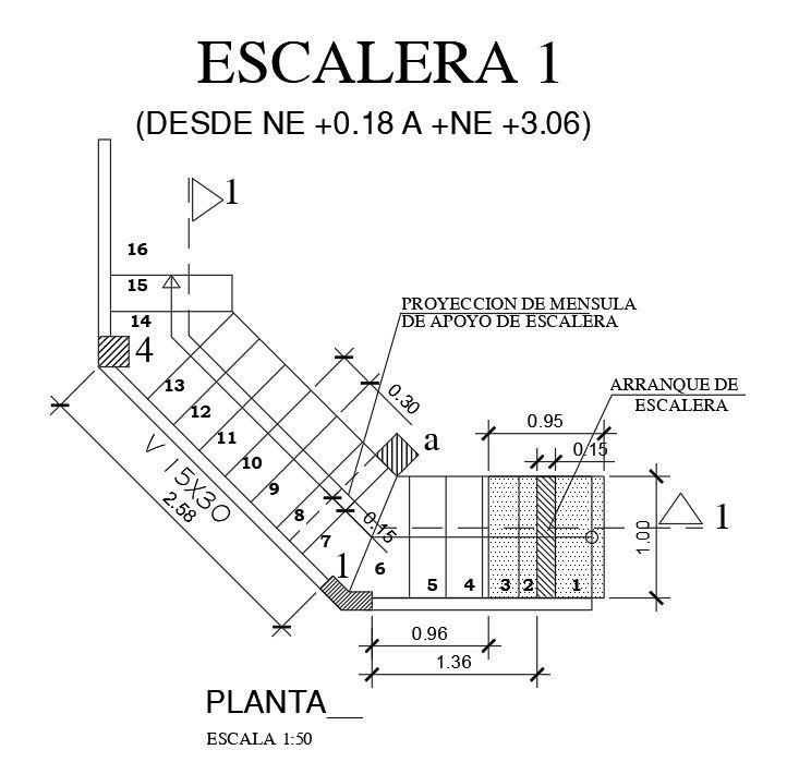 4m length of staircase plan is given in this Autocad drawing file. Breadth of the staircase is 1m. Thread and riser size is 300mm and 150mm respectively. For more details download the Autocad drawing file. Thank you for downloading the Autocad drawing file and other CAD program files from our website.