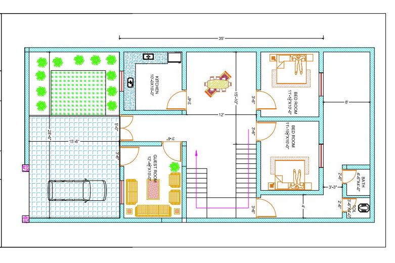 2 bhk house ground floor plan CAD drawing with car parking and garden detail in PDF format. get more detail for download house drawing and use this plan for your reference design.