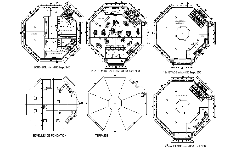 8m of hexagonal shape restaurant plan is given in this Autocad drawing file.Download the Autocad model.