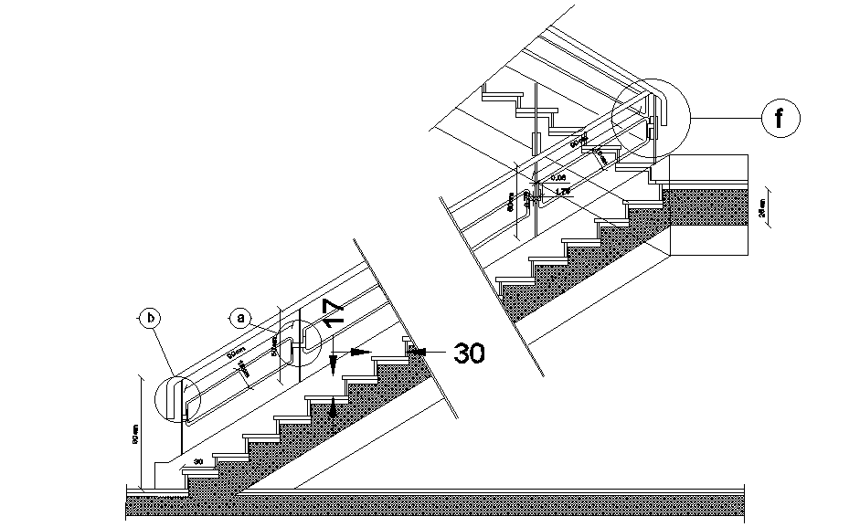 Staircase side elevation view is given in this Autocad drawing file. Breadth of the thread is 300mm. Height of the riser is 150mm. For more details download the Autocad drawing file. Thank you for downloading the Autocad drawing file and other CAD program files from our website.
