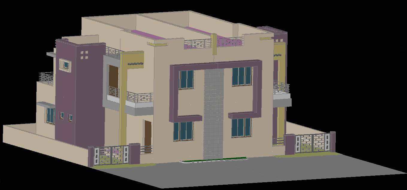 3D Twin House AutoCAD DWG Drawing with Rendered Exterior Design