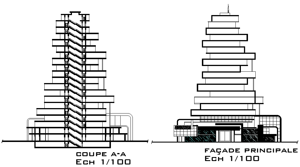 An elevation view of 70x65m hotel building is given in this Autocad drawing file.Download now.