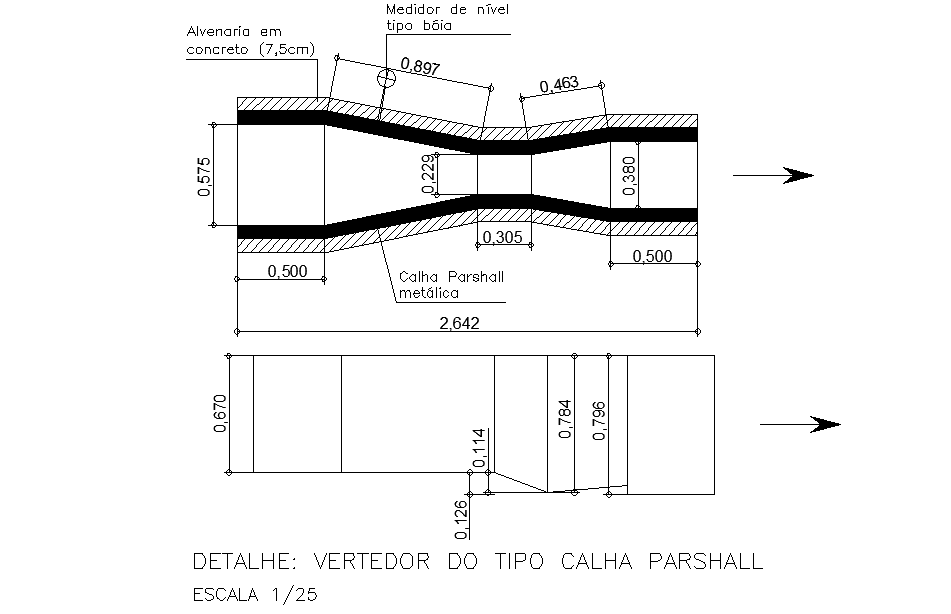 Parshall gutter type structure detail drawing is given in this model. Height of the structure is 0.670m. This is given for water treatment plant. Other details are given in this model. For more details download the Autocad drawing file. Thank you for downloading the Autocad drawing file and other CAD program files from our website.