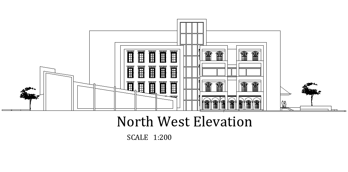 North & west elevation view of 57x50m municipal office building is given in this Autocad drawing file. Download now.