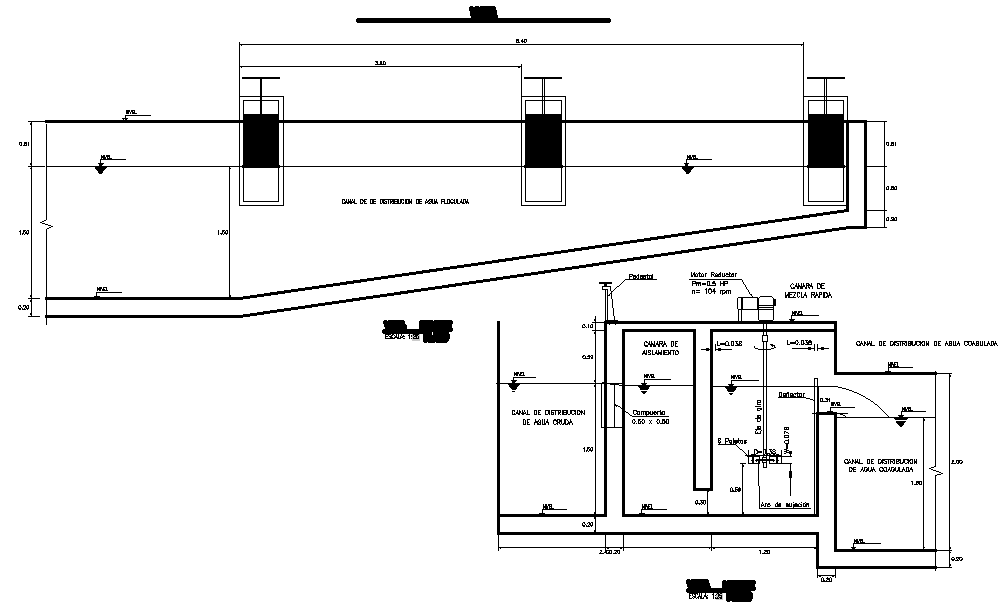 Coagulated water distribution channel is given in this Autocad drawing file. Flocculated water distribution channel has given in this model. Section views of the channels are given. For more details download the Autocad drawing file. Thank you for downloading the Autocad drawing file and other CAD program files from our website.