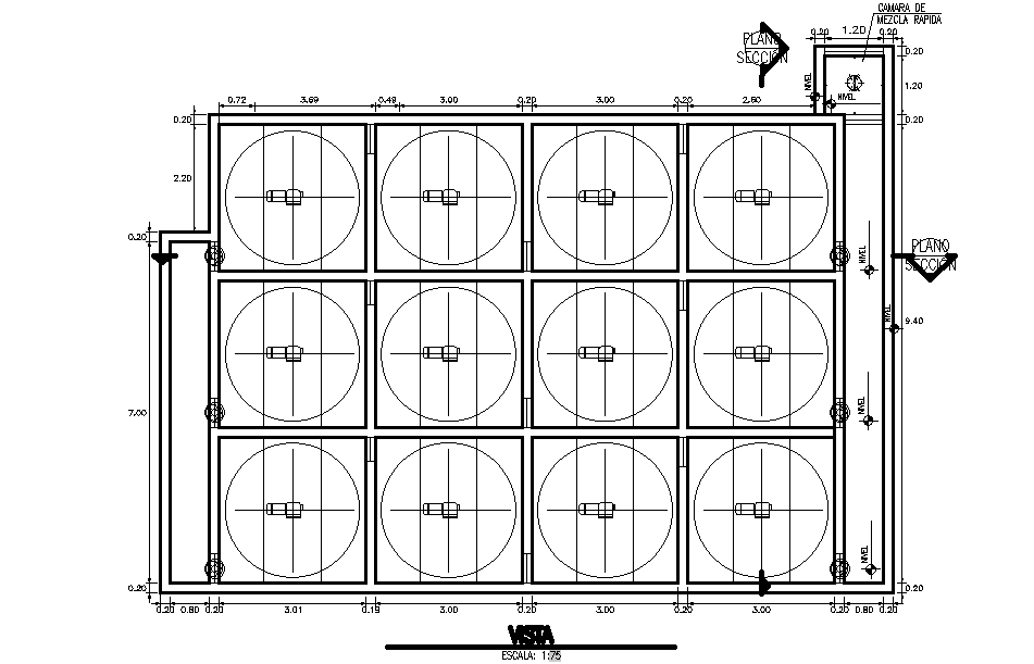 Flocculation unit plant is given in this Autocad drawing file. This is given for water treatment plant. Quick mixing chamber is provided at the top of the unit. For more details download the Autocad drawing file. Thank you for downloading the Autocad drawing file and other CAD program files from our website.