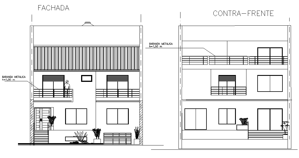 Front elevation view of 9x35m house cum guest room building is given in this Autocad drawing file.Download now.