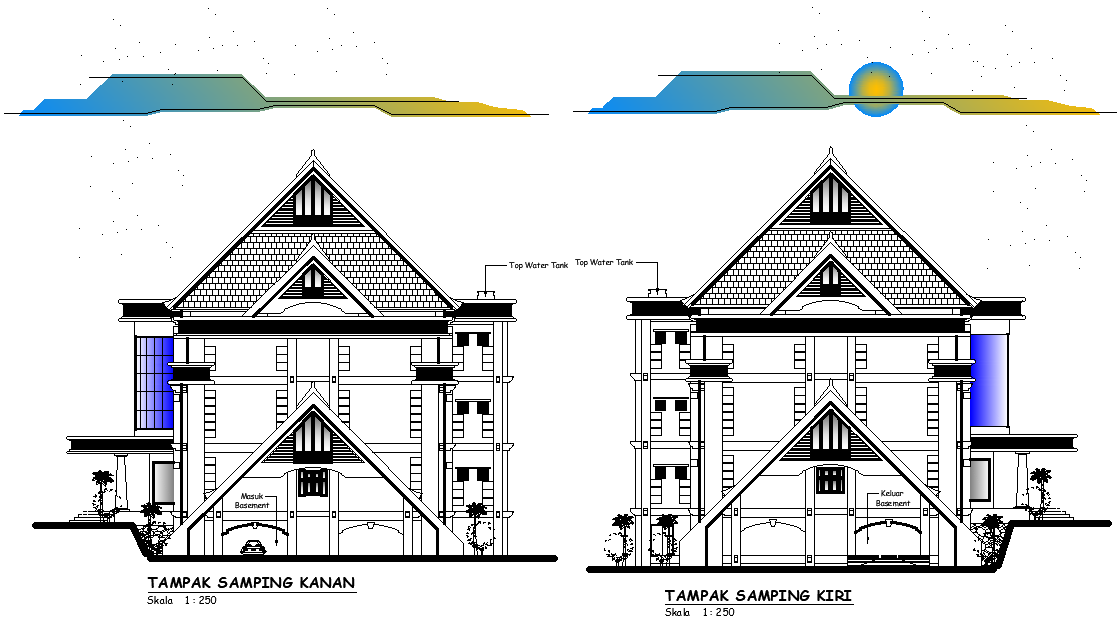 Left side elevation view of 64x18m office building is given in this Autocad drawing file. Download now.