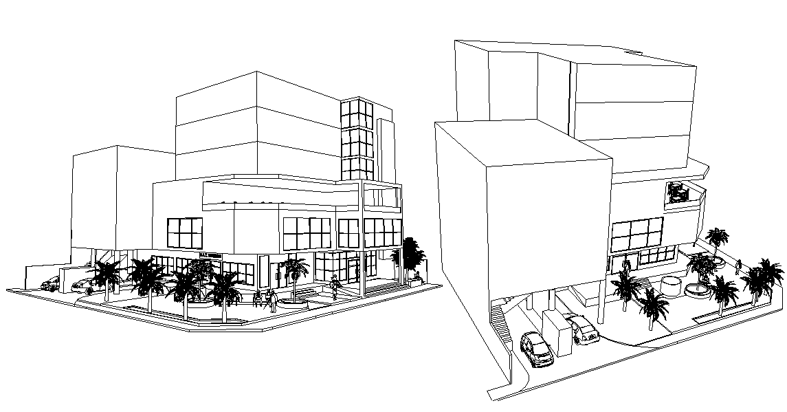 Perspective view of 32x28m municipal office plan is given in this Autocad drawing file.Download now.